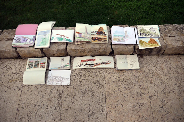 Orientei algumas ideias sobre paisagem, desenho em cadernos e panorâmicas, dispersamos pelas encostas e começamos a rabiscar.