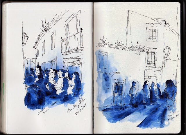 Num primeiro desenho, com alguma calma, ataquei a parte mais visível da anciã fortificação, num segundo momento, onde o tempo se perdia na conversa fui desenhando com menos rigor o amontoado de pedras perdido na vegetação.